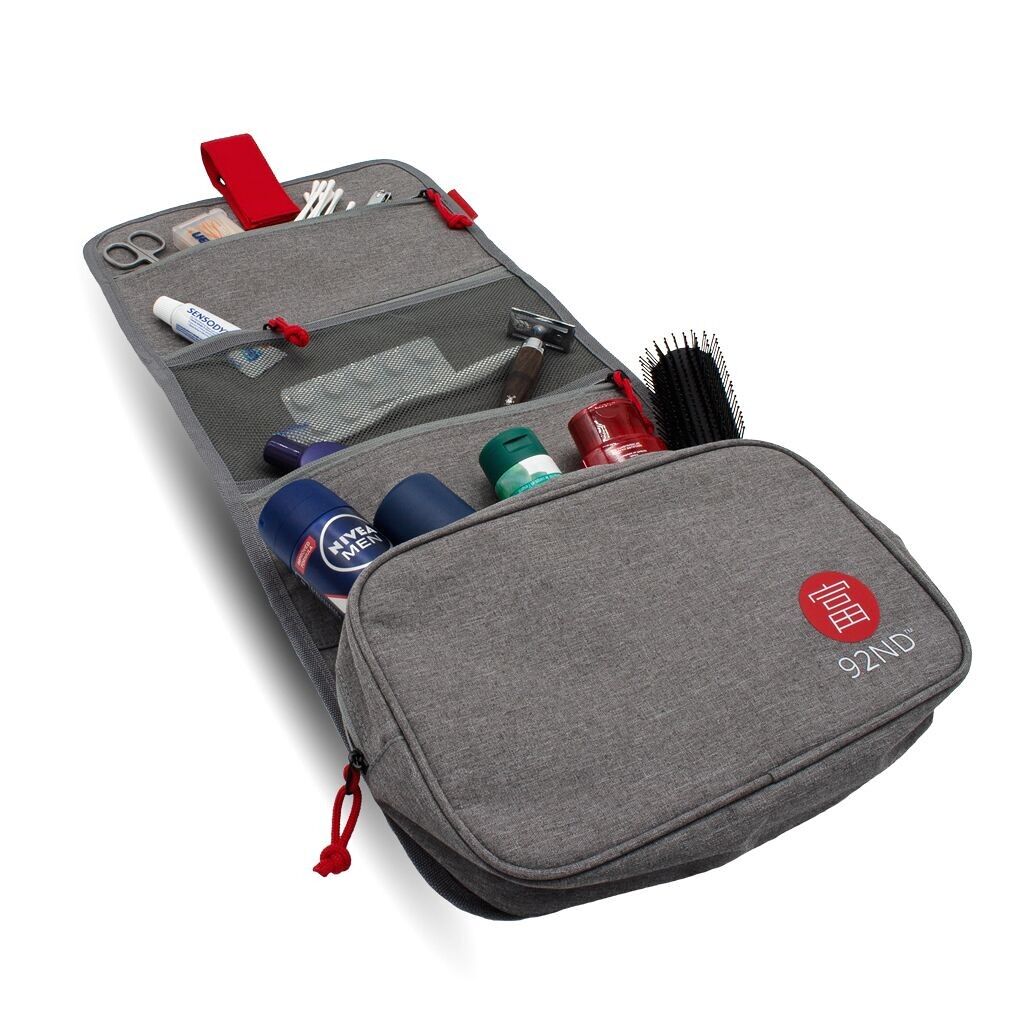 Der 92ND.SUPPLY Washroll Kulturbeutel in Grau ist die ideale Lösung für Damen und Herren, um Toilettenartikel auf Reisen geordnet zu verstauen. Mit einer durchdachten Aufteilung bietet er viele Fächer, darunter eine Netztasche und abnehmbare Fächer, alle sicher mit Reißverschlüssen verschlossen. Die praktische Aufhängung an Öse und Klettverschluss sorgt für einfachen Zugriff in jedem Badezimmer. Leicht zu reinigen und stilvoll in Seidenpapier und Geschenkbox verpackt, misst der Kulturbeutel 61 cm x 27 cm und bietet ausreichend Platz für alle wichtigen Utensilien.