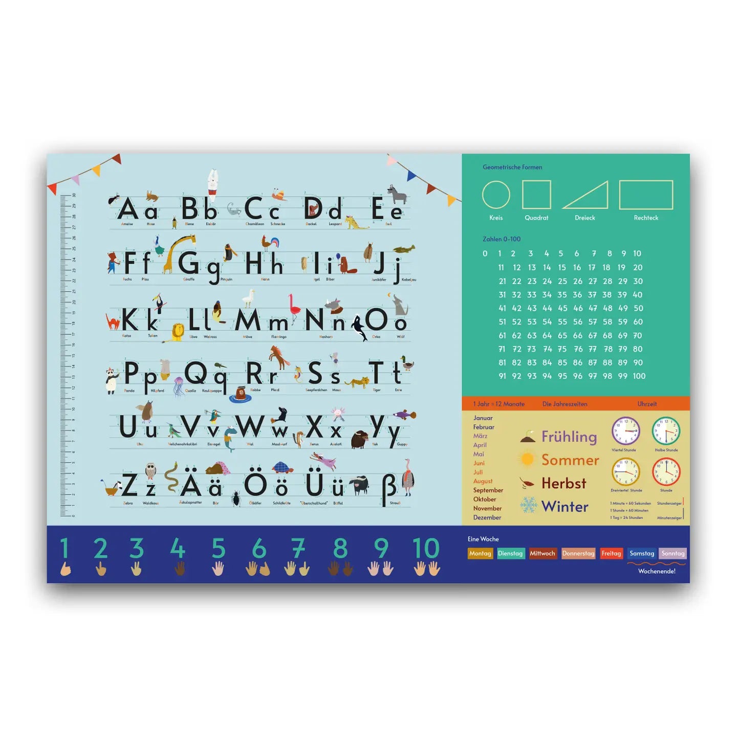 Die Alphabet Schreibtischunterlage von Close Up kombiniert spielerisches Lernen mit praktischer Funktionalität. Ideal für Grundschulkinder, bietet die liebevoll gestaltete Unterlage eine kindgerechte Weltkarte mit über 100 handgezeichneten Tieren, Sehenswürdigkeiten und Naturschauplätzen. Sie unterstützt das Lernen des Alphabets mit Tieren und vermittelt gleichzeitig Basiswissen wie Buchstaben, Zahlen, Monate, Wochentage, Uhrzeit und geometrische Formen.