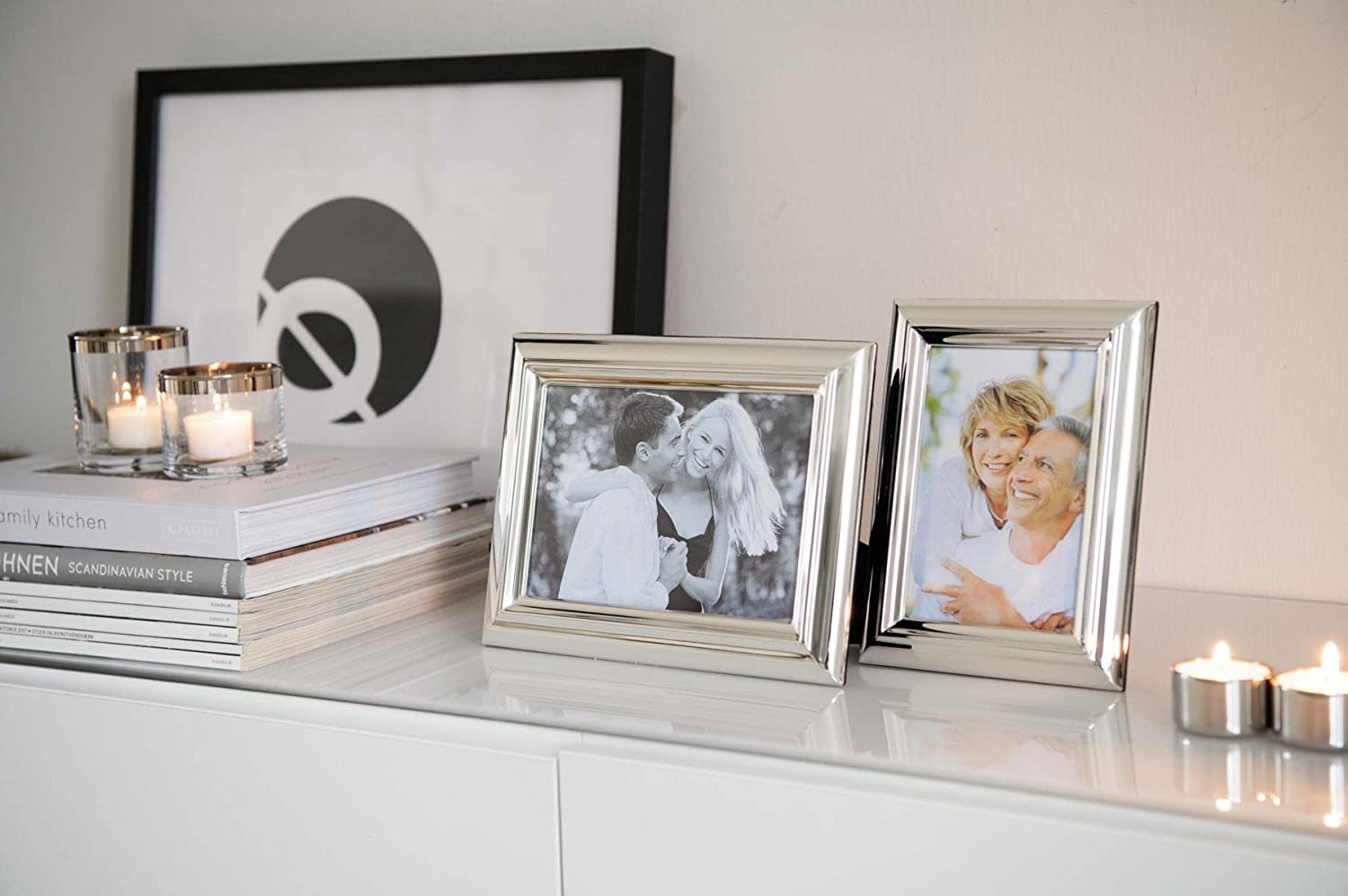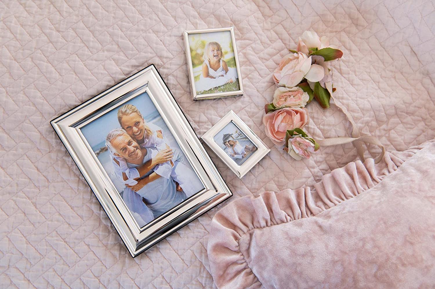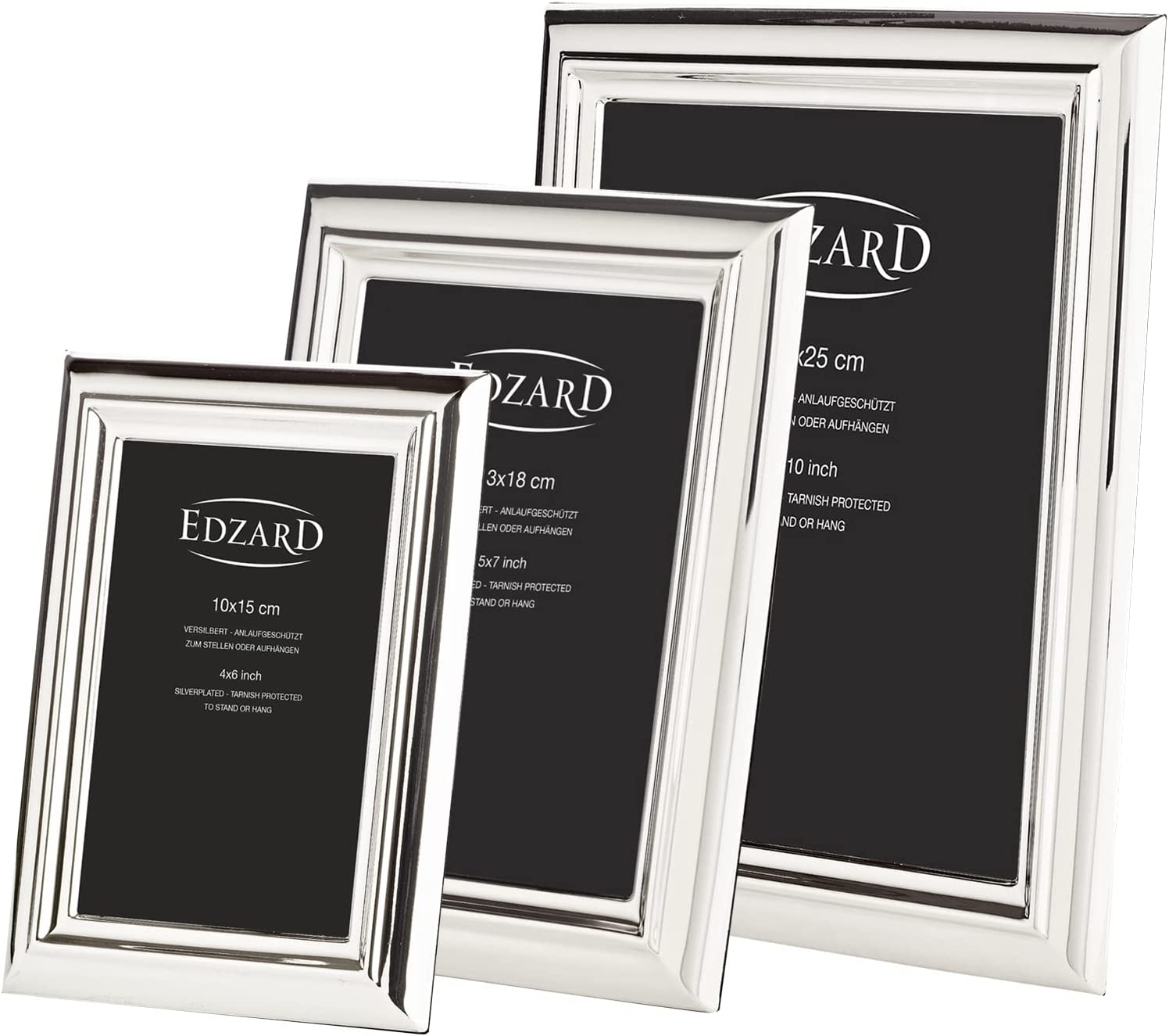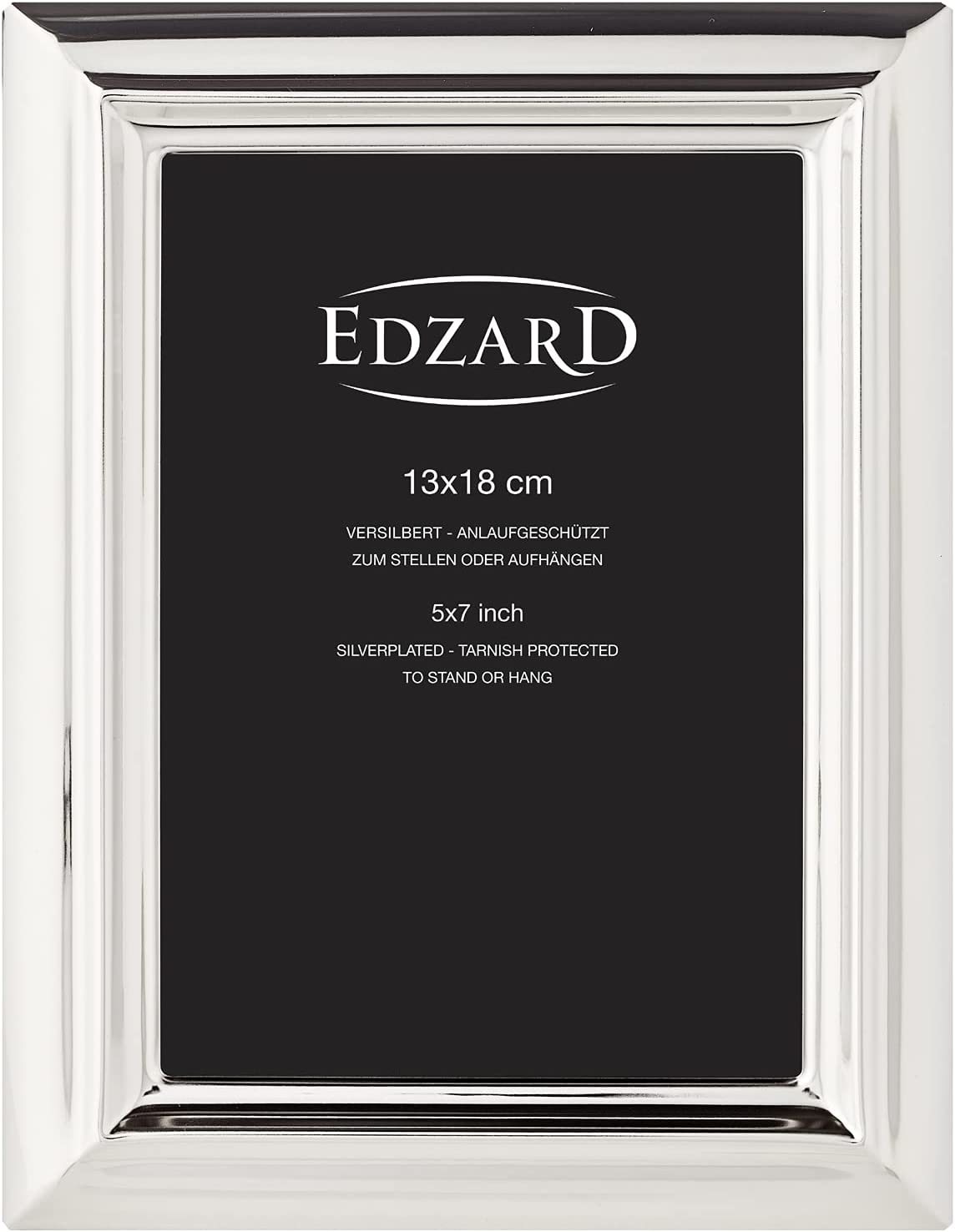 Der EDZARD Bilderrahmen Florenz ist ein eleganter Fotorahmen in hochwertiger Qualität. Die Bremer Silberwarenmarke EDZARD stellt seit 1975 hochwertige versilberte Fotorahmen her und ist bekannt für ihre exzellente Verarbeitung. Der Bilderrahmen ist anlaufgeschützt und kann leicht mit einem feuchten Tuch gereinigt werden. Dank des Samtrückens wirkt der Rahmen besonders edel und ist das perfekte Geschenk für verschiedene Anlässe wie Geburtstage, Hochzeiten, Taufen oder Weihnachten. Der Rahmen kann sowohl im Hoch- als auch im Querformat aufgestellt werden und ist mit zwei Aufhängevorrichtungen für die Wand ausgestattet. Der Rahmen ist passend für Fotos der Größe 13 x 18 cm und bietet mit dem Easy-Switch-System eine einfache Handhabung beim Wechseln von Fotos.