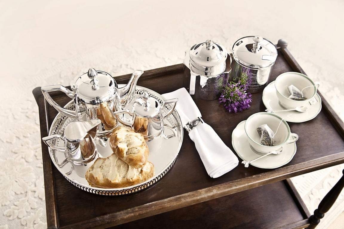 Das edel versilberte Serviertablett Delphi von EDZARD ist der perfekte Begleiter für jeden Anlass. Mit einem Durchmesser von 30cm eignet es sich perfekt für die Kommode, den Beistelltisch oder den Nachttisch. Egal ob Bier, Sekt, Snacks, Frühstück oder ein Buch, mit diesem Tablett transportieren Sie Ihre Gegenstände bequem und sicher an ihren Bestimmungsort. Dieses schöne Tablett eignet sich besonders gut, um Ihren Gästen damit Getränke zu reichen. Bestückt mit leckeren Cocktails oder raffinierten Leckereien fällt dieses wunderschöne Serviergeschirr garantiert direkt ins Auge! Durch seine robuste und hochwertige Verarbeitung eignet sich das Tablett sowohl für die Hotellerie und Gastronomie als auch für den Privatgebrauch, auf Partys und sogar im Outdoor Bereich. Wer denkt, dieses Tablett sei zu schön um es zu gebrauchen, der kann es auch einfach zur Dekoration benutzen. Richtig in Szene gesetzt werten die Serviertabletts von EDZARD einen Tisch, eine Kommode oder ein ganzes Zimmer enorm auf. Beschenken Sie sich selbst oder einen Freund. Mit diesem Tableau machen Sie dem Beschenkten mit Sicherheit eine Freude. Bei EDZARD finden Sie außerdem noch viele weitere schöne Tabletts.