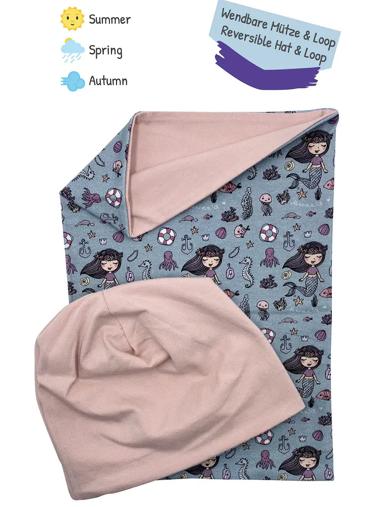 Das Highlight dieses Sets ist die Wendbarkeit der Weltraum Beanie Mütze und des passenden Loopschals. Beide Produkte können beidseitig getragen werden. Während eine Seite das farbenfrohe Meerjungfraun Design zeigt, ist die andere Seite in schlichtem Hellgrau gehalten. Dadurch lässt sich das Set vielseitig mit verschiedenen Kleidungsstücken kombinieren.