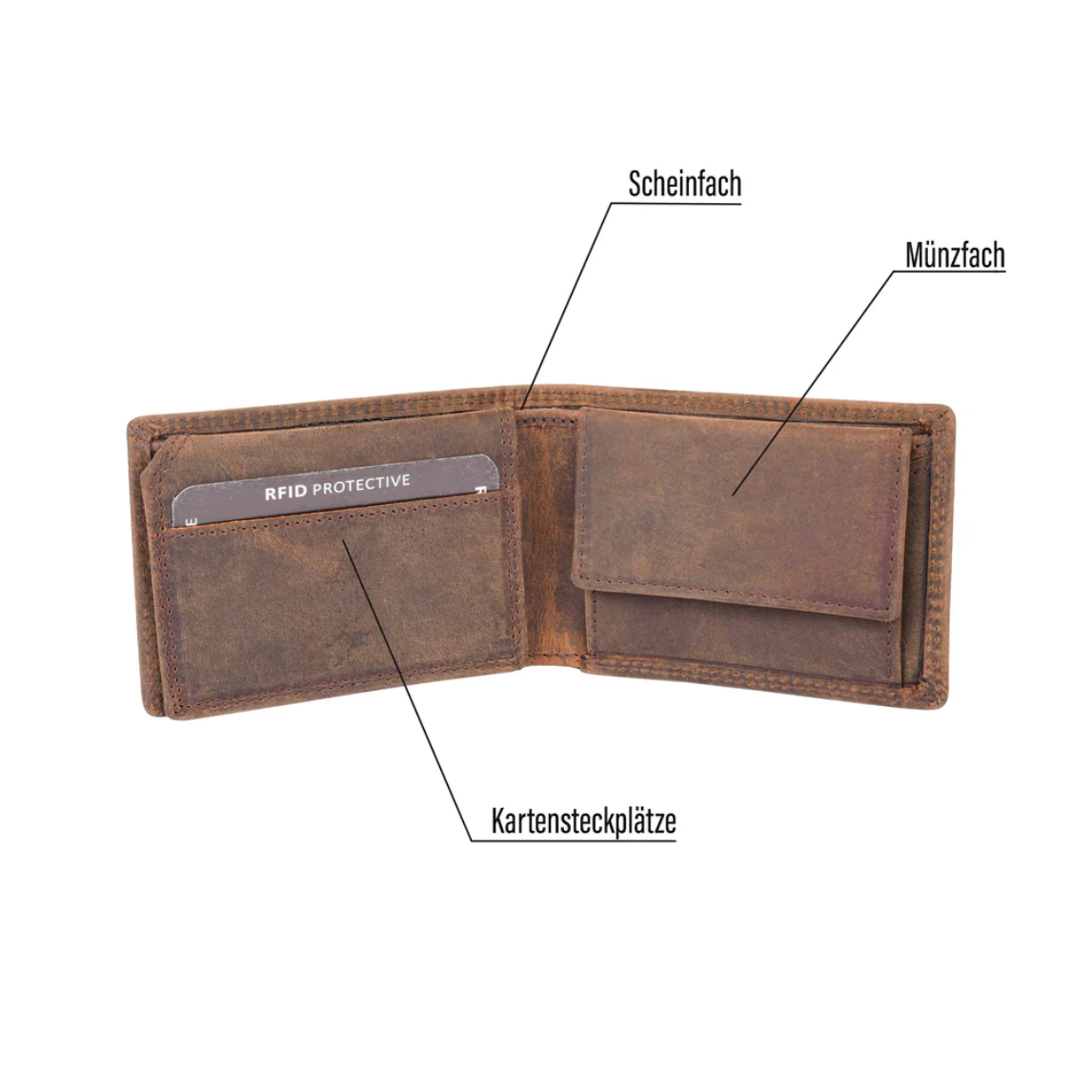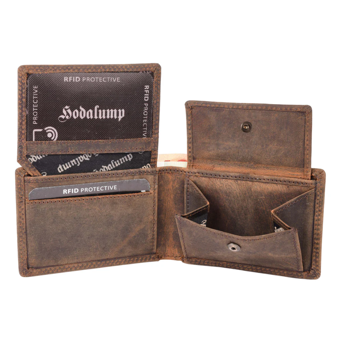 Die Hodalump Jeansbörse Buam ist die perfekte Wahl für alle, die eine kompakte und stilvolle Geldbörse suchen. Gefertigt aus braunem Vintage Echtleder, überzeugt sie mit einer robusten Verarbeitung und einem zeitlosen Design. Trotz ihres schlanken Formats bietet sie 3 Kartenfächer, ein Sichtfach, ein Münzfach und ein Scheinfach – ideal für das Wesentliche. Der integrierte RFID-Schutz sorgt für zusätzliche Sicherheit und verhindert das unbefugte Auslesen deiner Karten.