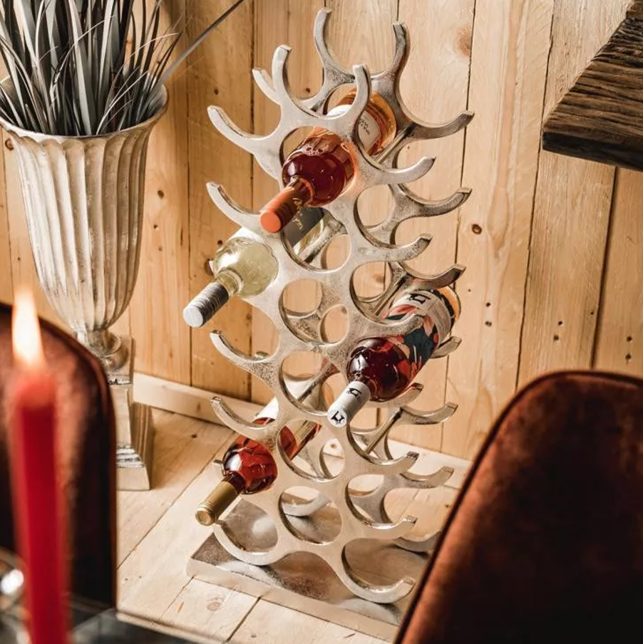 Die silberne Farbe verleiht dem Weinregal einen zeitlosen Charme und strahlt Luxus aus. Ob im Wohnzimmer, in der Küche oder im Büro, dieses Flaschenregal ist nicht nur funktional, sondern auch ein exklusives Wohnaccessoire, das Ihre Dekoration aufwertet.