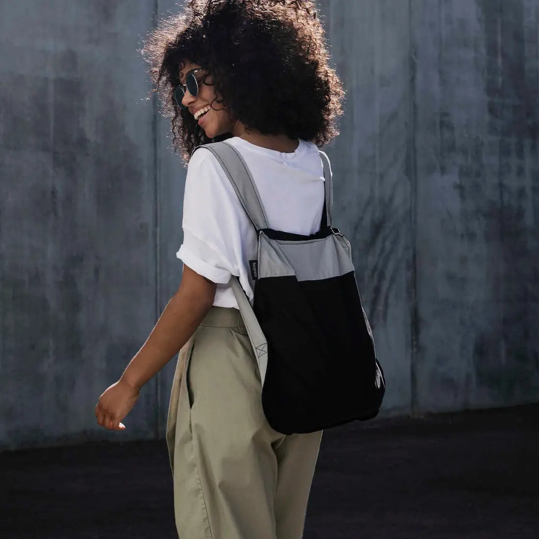 Entdecken Sie das Notabag Original in Grau/Schwarz - die innovative, multifunktionale Tasche, die sich im Handumdrehen in einen Rucksack verwandelt. Mit nur einem Zug an den Trägern genießen Sie maximale Flexibilität und befreien Ihre Hände im Nu. Die integrierte aufgesetzte Tasche ermöglicht eine sichere Aufbewahrung von Brieftasche oder Schlüsseln, während das Minimal-Design der Tasche bei Nichtgebrauch in einen handlichen Beutel gefaltet werden kann.