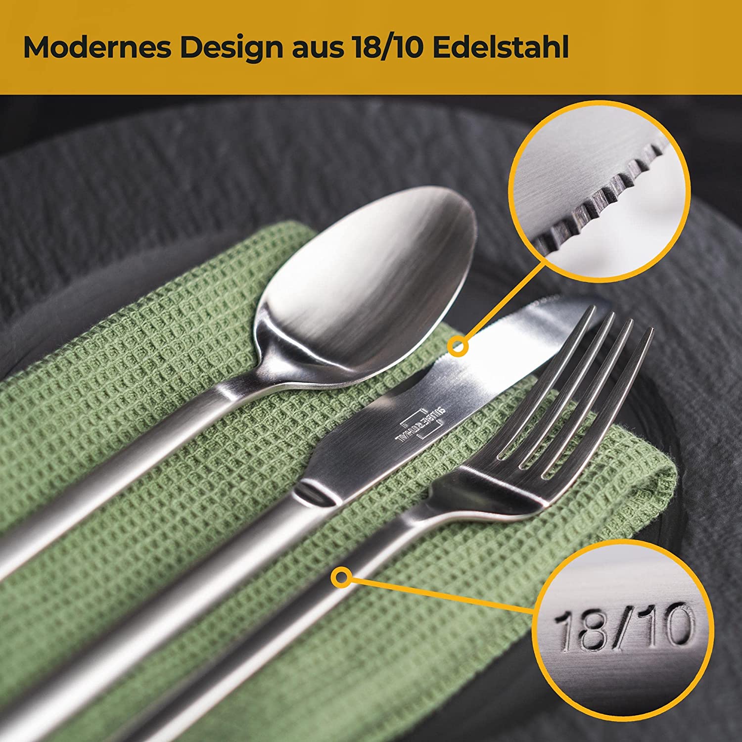 Mit dem zeitlosen Design des SILBERTHAL Besteck Sets für 6 Personen wird jeder Anlass stilvoll gedeckt. Das Set besteht aus jeweils sechs Menülöffeln, -gabeln, -messern, Kaffeelöffeln und Kuchengabeln aus hochwertigem Edelstahl (18/10). Die ergonomische Form, ausbalanciertes Gewicht und abgerundete Spitzen sorgen für angenehmes Handling und Mundgefühl. Die Monoblock-Messer sind aus einem hochwertigem Klingenstahl (420) mit handgeschliffenem Wellenschliff und besonders scharf. Das Besteck ist spülmaschinenfest, rostfrei und wird in einer eleganten schwarzen Schachtel geliefert, die sich auch perfekt als Geschenk zu verschiedenen Anlässen eignet. Inklusive OEKO-TEX zertifizierte Filztasche für unterwegs.