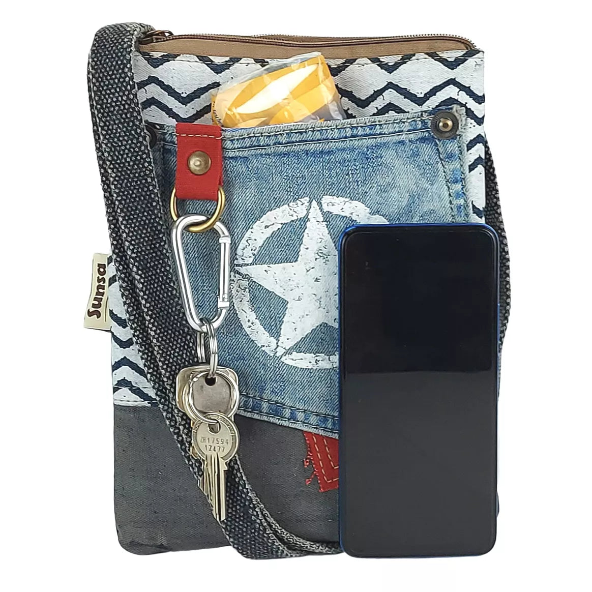 Das Design dieser Tasche zeichnet sich durch einen Vintage-Retro-Stil mit einem Stern auf der Vorderseite aus, der durch einen Metallring für Schlüsselanhänger betont wird. Sunsa setzt auf Nachhaltigkeit, indem sie recycelte Jeans und andere gebrauchte Materialien verwendet, um Müll zu reduzieren und den Verbrauch neuer Ressourcen zu minimieren.