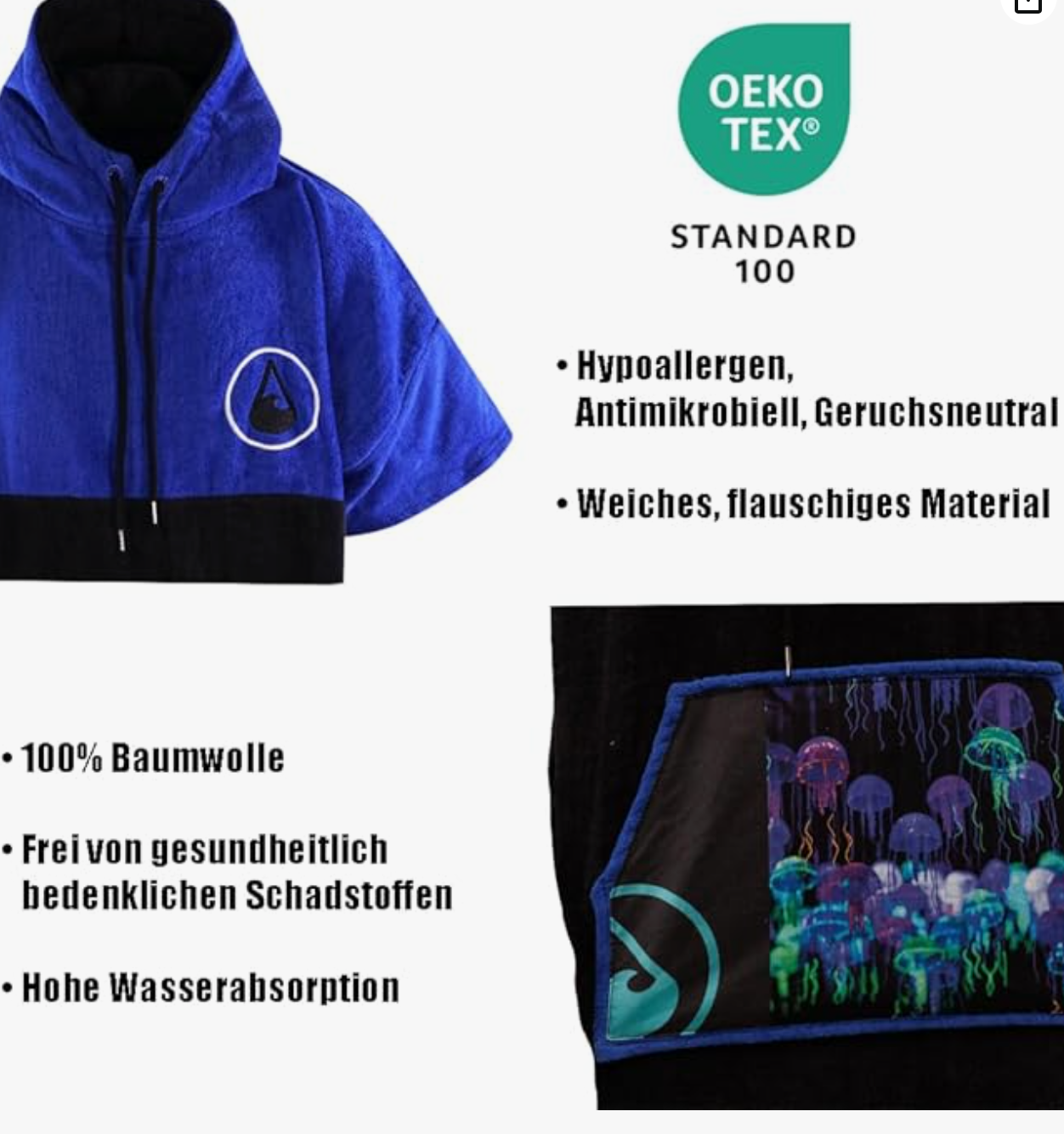 Der Wave Hawaii Jellygang Surfponcho ist die ideale Umkleidehilfe für Körpergrößen von 170 bis 200 cm. Aus 100% ÖKO Baumwolle, zertifiziert nach Öko Tex Standard 100, sorgt er für Wärme und Komfort beim Umziehen am Strand oder im Schwimmbad.