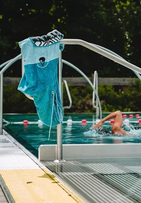 Die zweilagige Kapuze mit hohem Kragen und Kordel bietet nicht nur Wärme, sondern schützt deinen nassen Kopf optimal. Die geräumige Fronttasche macht den Poncho nicht nur praktisch, um Utensilien wie Shampoo oder Bürste zu verstauen, sondern bietet auch Platz für kalte Hände.